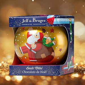 « LA BOULE DE NOËL EN MÉTAL Jeff de Bruges » garnies de délicieux Choco’pralinés et de carrés en chocolat au lait.